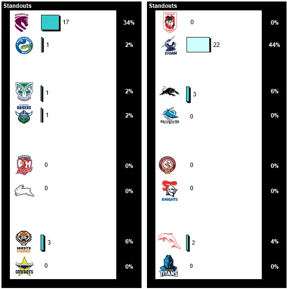 - View the split of tips per match or toggle to see how many are riding each team as their Standout.