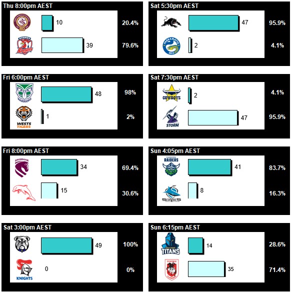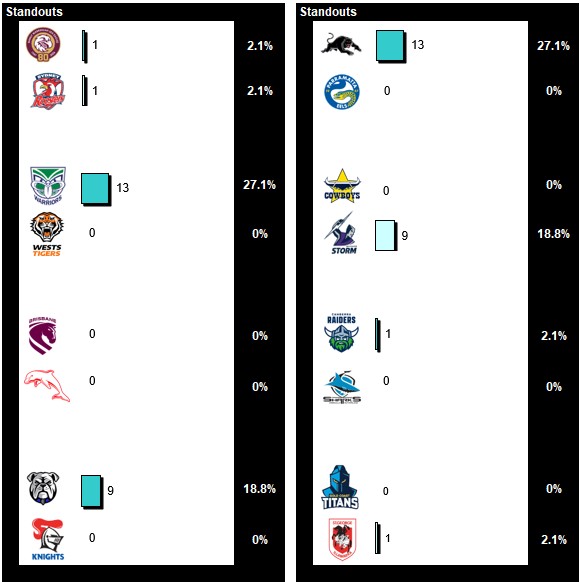 - View the split of tips per match or toggle to see how many are riding each team as their Standout.