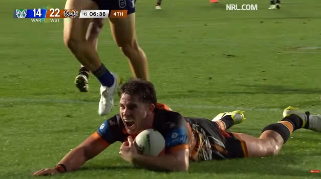 The Wests Tigers were behind on every stat possible just before halftime trailing the unbeaten Warriors 10-nil before crossing the line three times to take a halftime advantage of 10-16.